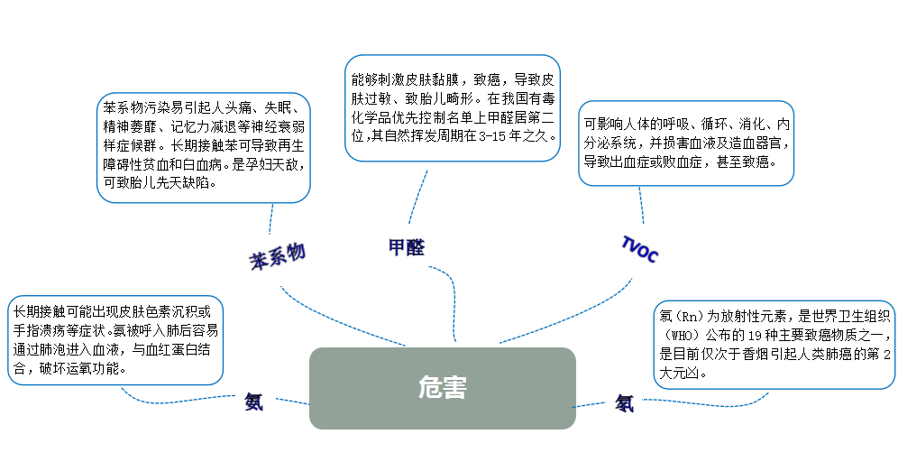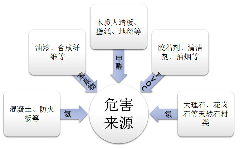 根據(jù)2020年8月1日我國最新實施的GB 50325-2020《民用建筑工程室內(nèi)環(huán)境污染控制標準》,我國民用建筑室內(nèi)空氣污染物主要包括:甲醛、TVOC(總揮發(fā)性有機化合物)、苯系物、氡氣、氨氣等,其主要來源及危害見下圖。