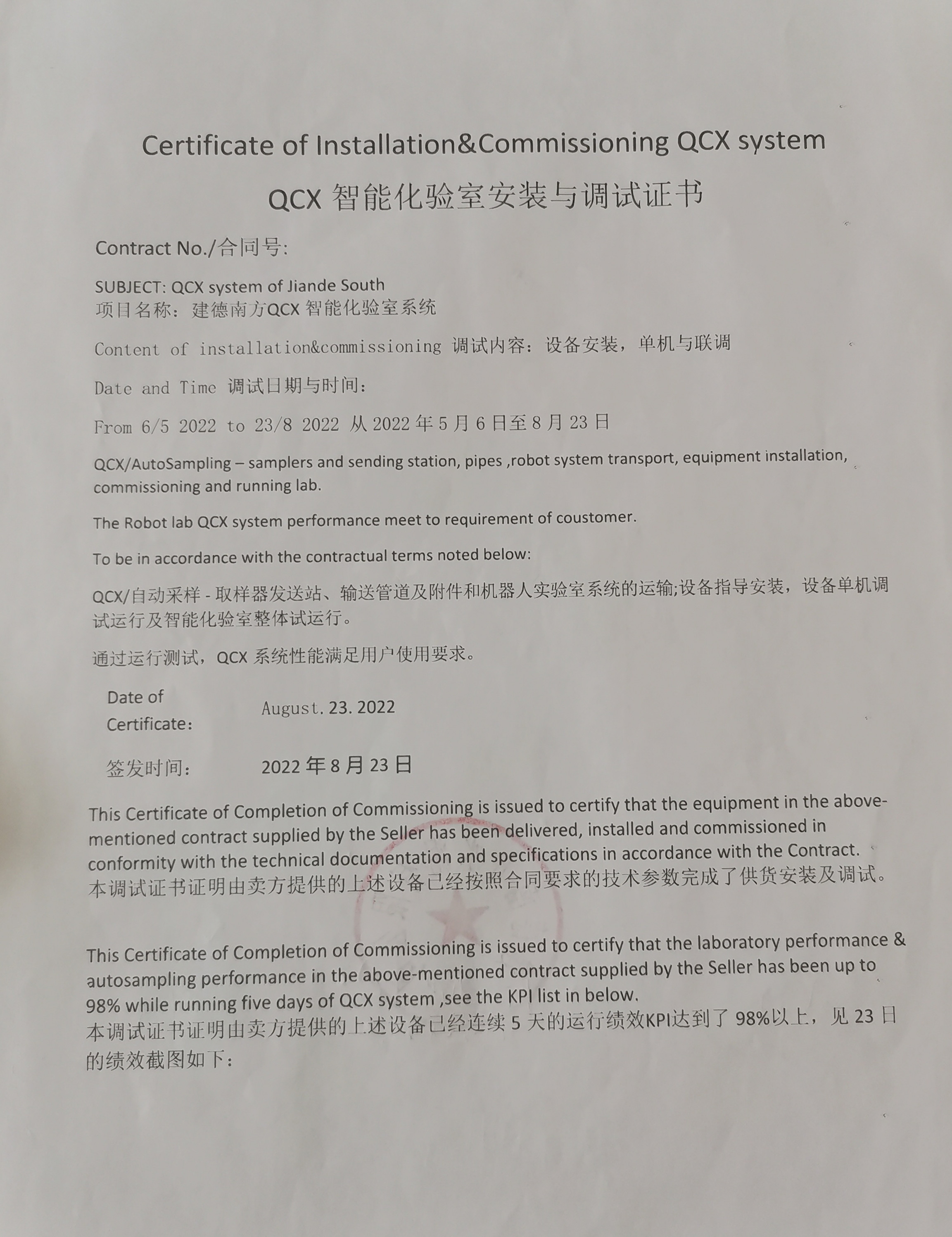 本次QCX系統(tǒng)設(shè)備由HNBMI自行安裝,艾法史密斯公司指導(dǎo)調(diào)試,實(shí)驗(yàn)室建設(shè)過程中,我院項(xiàng)目部合理制定搭建計(jì)劃,主動配合業(yè)主生產(chǎn),全力克服疫情難艱,高效完成了本次建造任務(wù),并順利通過了系統(tǒng)的性能測試,客戶給予高度認(rèn)可。