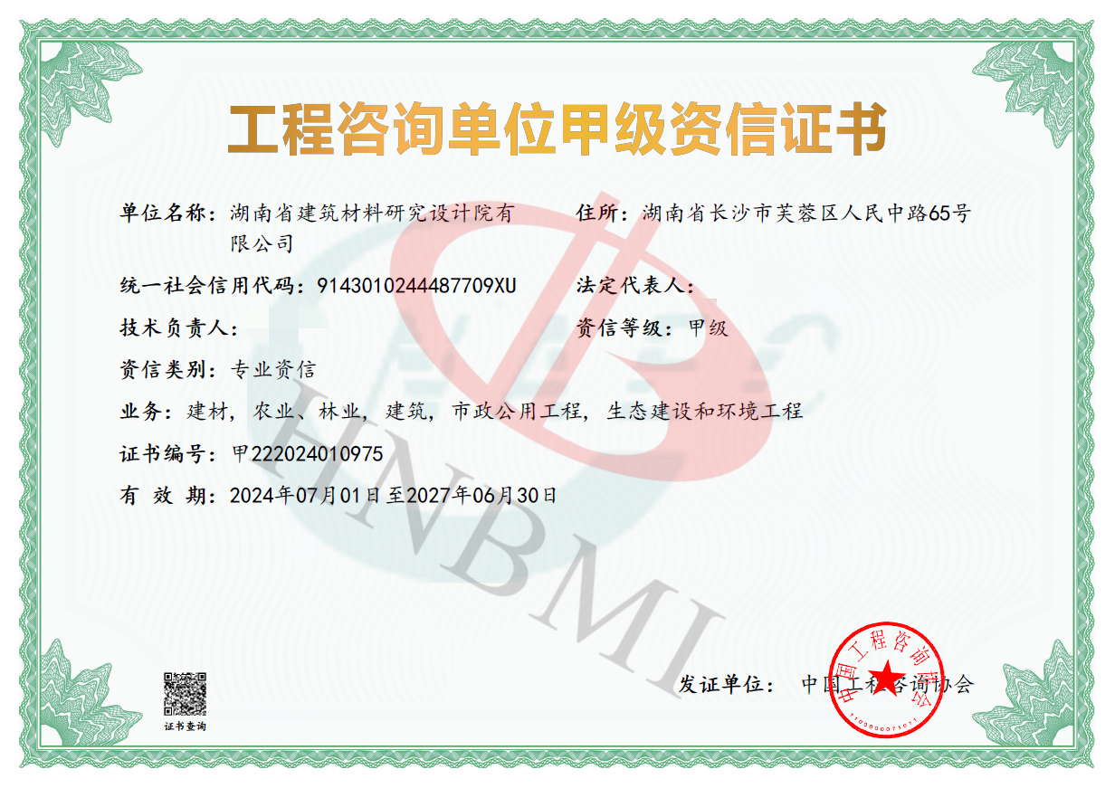 2024年6月28日,根據(jù)《中國工程咨詢協(xié)會公告2024年第6號》,湖南省建筑材料研究設(shè)計院有限公司的建材、農(nóng)業(yè)/林業(yè)、建筑、市政公用工程、生態(tài)建設(shè)和環(huán)境工程五個專業(yè)獲評甲級資信。這標志著HNBMI綜合技術(shù)能力更進一步,競爭力穩(wěn)步提升。